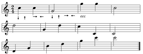 Nell'esempio mostrato nella successiva fig. 23, il brano riporta dopo la chiave l'indicazione di 2/4. Questa frazione indica che ogni battuta del brano contiene una somma di valori che corrisponde a due quarti, cioè una metà. L'andamento ritmico di un brano in 2/4 è binario, cioè è costituito in sostanza da due movimenti ciascuno dei quali contiene un battere e un levare.