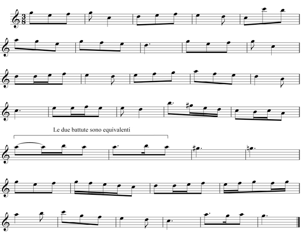 Sommando i 2 quarti aumentati, otterrete un valore complessivo di 6 ottavi. Da una battuta di 2/4, avrete ottenuto, per aumentazione di tutti i suoi tempi, il tempo in 6/8.