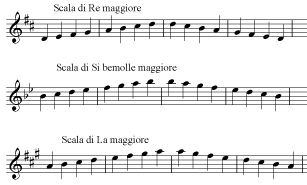 Nella scala di Re maggiore accennata sopra, abbiamo visto che il Fa# ed il Do# dovranno essere sempre presenti. Nella scala di Si bemolle maggiore, sarà necessario usare sempre il Si bemolle ed il Mi bemolle; per la scala di La maggiore sarà necessario usare sempre il Fa#, il Do# ed il Sol#.