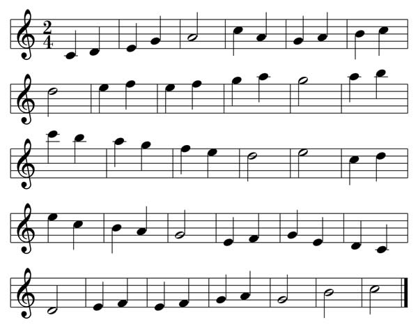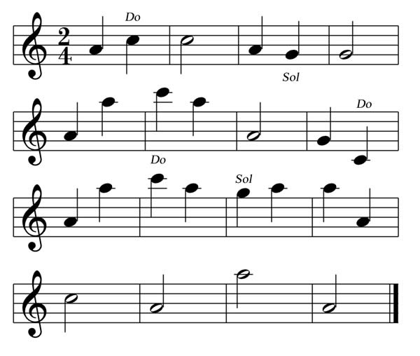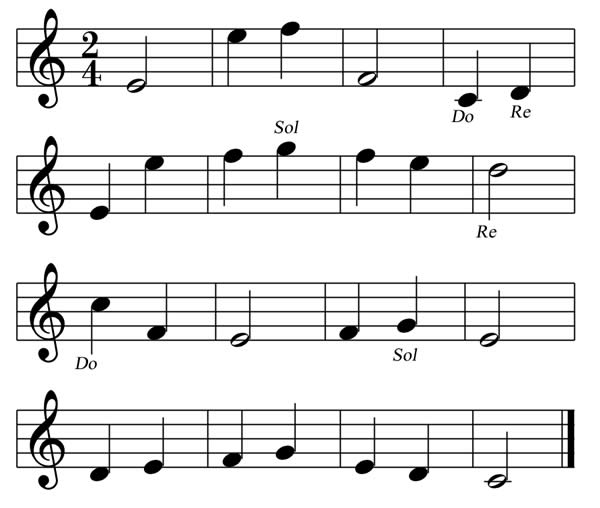 Questo esercizio è dedicato alla memorizzazione delle posizioni dei MI e dei FA. I MI sono collocati rispettivamente sulla prima riga e nell'ultimo spazio. I FA sono collocati sul primo spazio e sull'ultima riga.